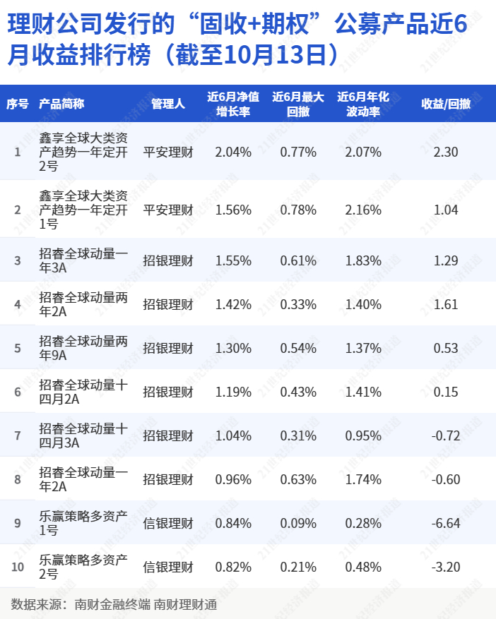 据南财理财通数据,截至10月13日,在理财公司“固收+期权”公募产品近6月收益榜单中,三家理财公司产品进入榜单前十,上榜产品来自平安理财“鑫享全球”系列,招银理财“招睿全球动量”系列,信银理财“乐赢策略多资产”系列新进入榜单。