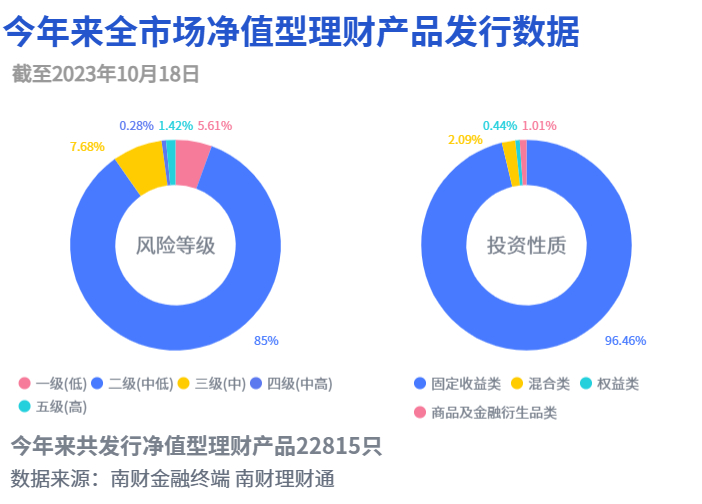据南财理财通最新数据,截至2023年10月18日,今年来全市场已发行净值型银行理财产品22,815只(含私募产品)。