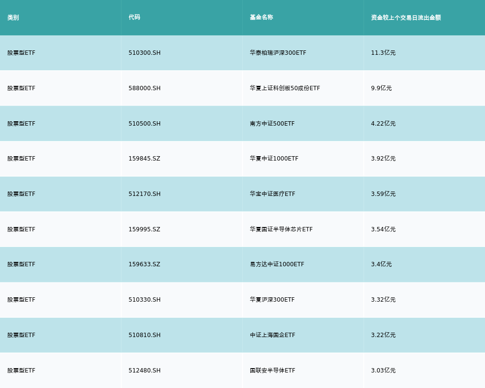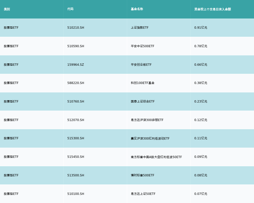 昨日股票型ETF资金流入最多的3支ETF及其流入金额分别为:上证指数ETF(流入0.91亿元)、平安中证500ETF(流入0.78亿元)、平安创业板ETF(流入0.66亿元)。资金流入前10详情见下表: