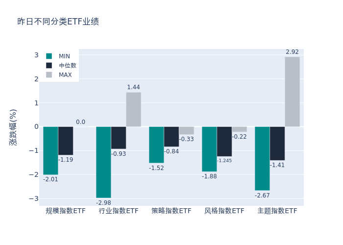 昨日股票型ETF收益率中位数为-1.26%。其中按照不同分类,规模指数中博时标普500ETF收益率最高,为0.0%;行业指数中国泰中证800汽车与零部件ETF收益率最高,为1.44%;策略指数中央企红利收益率最高,为-0.33%;风格指数中招商中证银行AH价格优选ETF收益率最高,为-0.22%;主题指数中广发中证全指汽车ETF收益率最高,为2.92%。