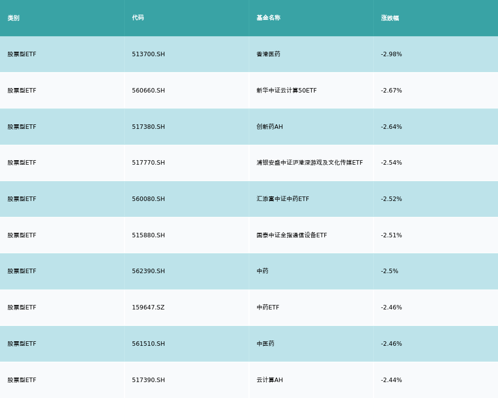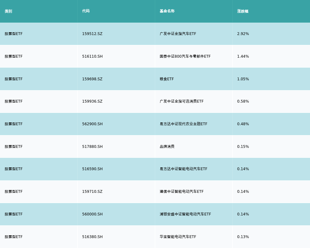昨日股票型ETF涨幅最高的3支ETF及其收益率分别为:广发中证全指汽车ETF(2.92%)、国泰中证800汽车与零部件ETF(1.44%)、粮食ETF(1.05%)。涨幅前10详情见下表: