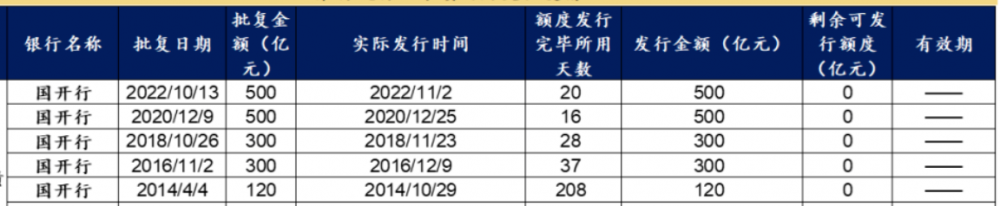事实上,历史信息显示,在监管部门核准国家开发银行发行二级资本债后,该行都会在较短的时间内一次性用完批复额度。如2022年在第20天用完500亿元批复额度,2020年在第16天用完500亿元批复额度,2018年在第28天用完300亿元批复额度。