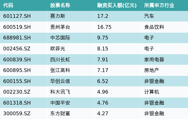 10月19日,两市共有3293只个股有融资资金买入,其中赛力斯、贵州茅台、中芯国际排名前三,买入金额分别17.2亿元、16.75亿元、9.75亿元。融资买入额前10个股详情见下表: