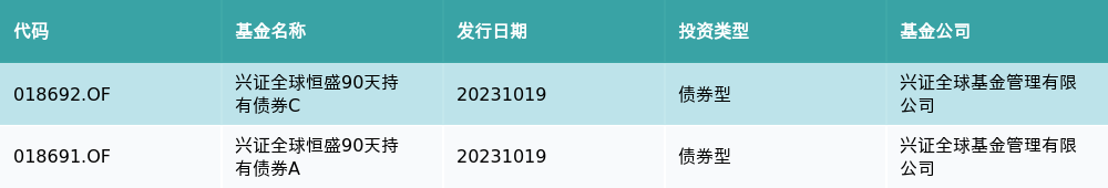 10月19日有2只新基金发行,分别为:兴证全球恒盛90天持有债券C、兴证全球恒盛90天持有债券A,详情见下表: