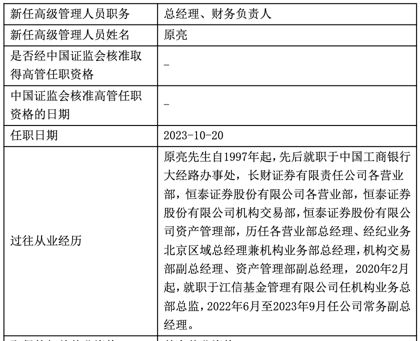 10月20日,江信基金发布公告表示,焦毛因个人原因离任总经理、督察长,由副总经理原亮转任公司总经理及财务负责人。