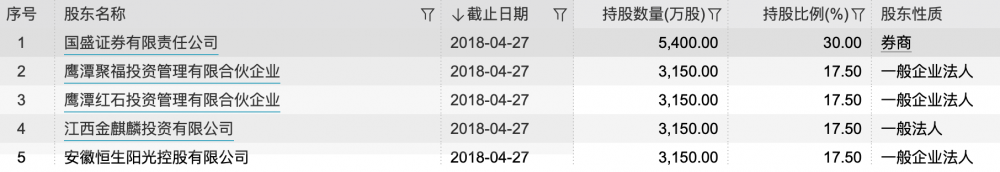 Wind数据显示,江信基金成立于2013年1月,控股股东为国盛证券,持股30%;另外有四家股东分别持有17.5%的股份,为金麒麟投资有限公司、鹰潭红石投资管理有限合伙企业、鹰潭聚福投资管理有限合伙企业、安徽恒生阳光控股有限公司。