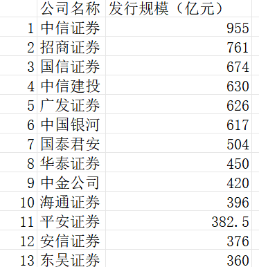 此外,海通证券、平安证券、安信证券、东吴证券发债规模在400亿元——360亿元(含360)区间。