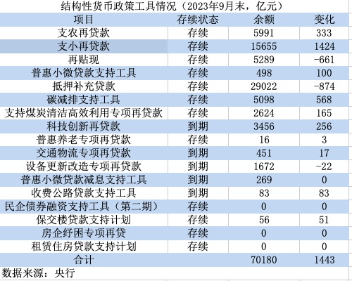 从余额看,三季度末结构性货币政策工具余额为7万亿,相比二季度末增长1443亿。其中支小再贷款、碳减排支持工具余额增长较多,分别增长1424亿、568亿,显示对两个领域的支持力度加大。