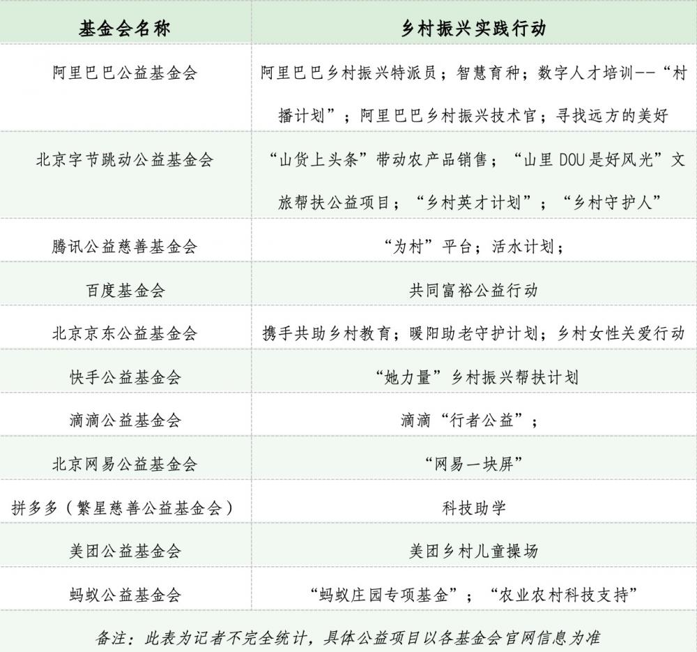 21世纪经济报道记者不完全统计,当前互联网头部企业Top10均已成立企业基金会。在各基金会对助力乡村振兴公益行动信息披露相对完善和详实的是阿里巴巴公益基金会和北京字节跳动公益基金会。