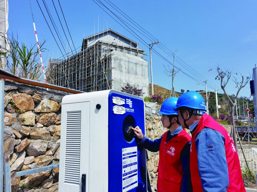 南方电网广东梅州丰顺供电局工作人员正在检查凤坪村的新建充电桩设备。 (徐奕燊 摄)