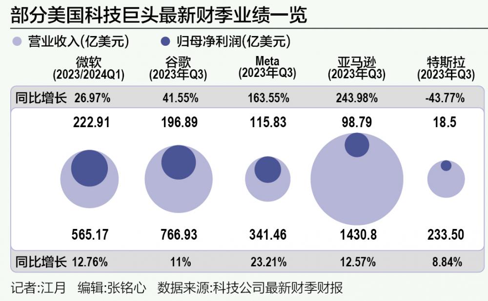 根据各公司财报,7月至9月,特斯拉、微软、Alphabet、亚马逊、Meta合计获得收入3338.5亿美元。