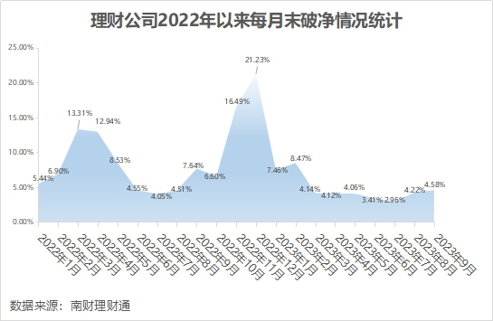 南财理财通数据独家显示,截至9月底,理财公司存续公募产品数量为14,141只,合计有647只产品净值在1以下,综合破净率为4.6%。