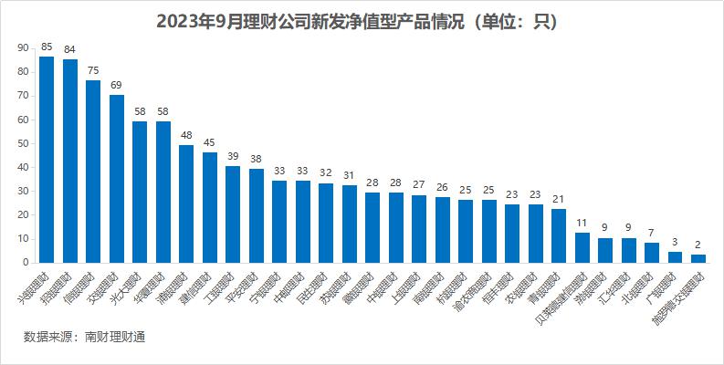 南财理财通数据显示,2023年9月,有29家理财公司合计发行了995只理财产品(同一产品登记编码下不同份额合并计算),环比8月下降17.77%,回调至7月水平。发行数量位居前三的理财公司分别为兴银理财、招银理财和信银理财,依次发行85只、84只和75只。