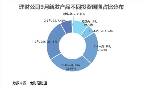 从投资周期看,投资周期为3个月内的理财新品占比较8月收敛,其余投资周期新品占比较8月上升。其中,投资周期一月以内的产品有102只,占比10.42%,较8月降幅最大,环比下降12.16%。3-6个月(含)投资期限的产品有206只,占比21.04%,较8月增幅最大,环比上升5.74%;投资周期为6-12个月(含)的产品有284只,占比为29.01%;投资周期1-2年(含)的产品有256只,占比26.15%;其余投资周期产品新发数量占比较低。