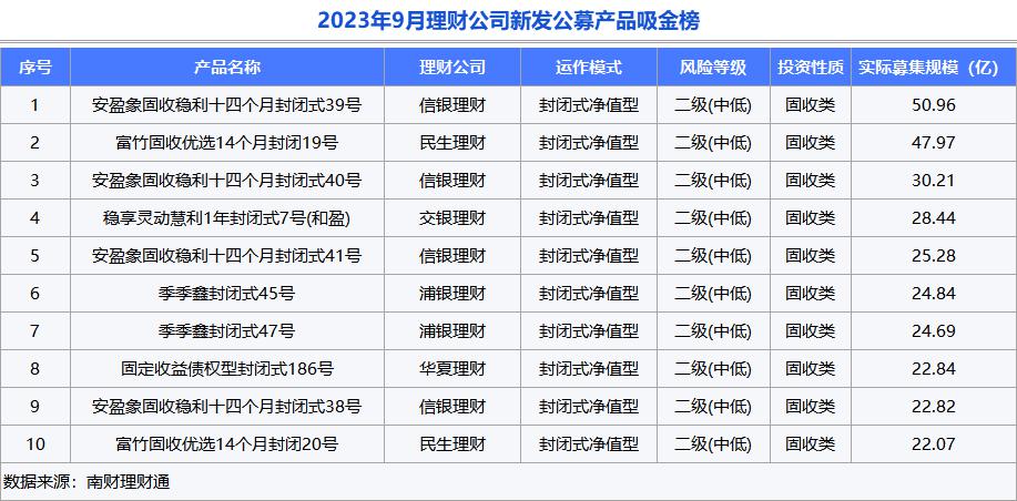 具体到产品上,9月公募理财上榜产品“吸金”能力与8月相近。此次5家理财公司产品角逐榜单前十,信银理财产品占4席,民生理财和浦银理财产品各占2席,华夏理财和交银理财产品占1席。榜首信银理财“安盈象固收稳利十四个月封闭式39号”,募集规模为50.96亿元;民生理财“富竹固收优选14个月封闭19号”和信银理财另一只产品“安盈象固收稳利十四个月封闭式40号”为本期吸金榜第二名和第三名,募集规模分别为47.97亿元和30.21亿元。值得注意的是,本期上榜产品为中低风险的封闭净值型固定收益类产品。