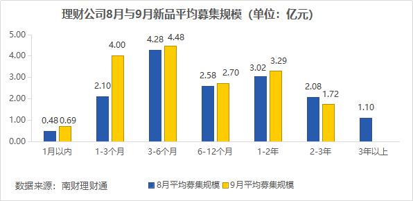 从9月理财公司单只理财产品平均募集规模来看,月平均募集为3.13亿元,较8月的2.84亿元平均募集规模上升0.28亿元。投资周期2年以内产品募集规模均有一定上涨,投资周期为1月以内(含)的新发产品平均募集规模升至0.69亿元,1-3个月(含)、3-6个月(含)、6-12个月(含)、1-2年(含)期限产品平均募集规模升至4亿元、4.48亿元、2.7亿元、3.29亿元,投资周期为2-3年(含)新发理财产品平均募集规模降至1.72亿元。