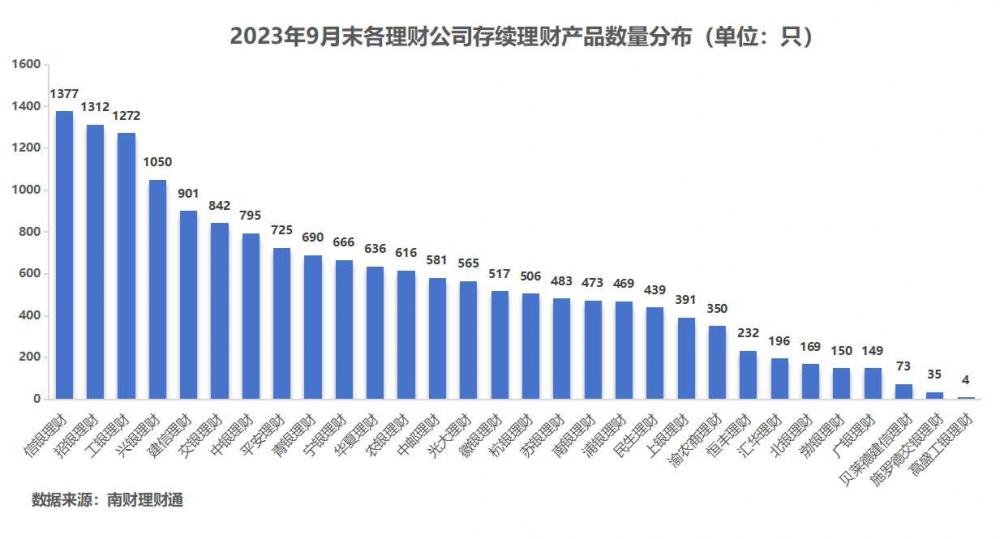 按发行机构来看,信银理财、招银理财和工银理财的存续产品数量包揽前三,分别为1,377只、1,312只和1,272只,依次占发行总量的8.26%、7.87%和7.63%。