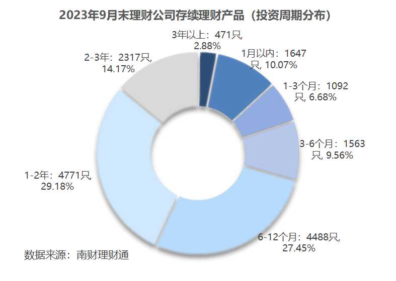 从投资周期来看,9月末存续产品投资周期仍集中在6-12个月(含)和1-2年(含),占比分别为27.45%和29.18%。投资周期为2-3年(含)的存续产品占比为14.17%,投资周期为3-6个月(含)和1月以内的存续产品占比比较接近,分别为9.56%和10.07%,其余投资周期存续产品占比较小。
