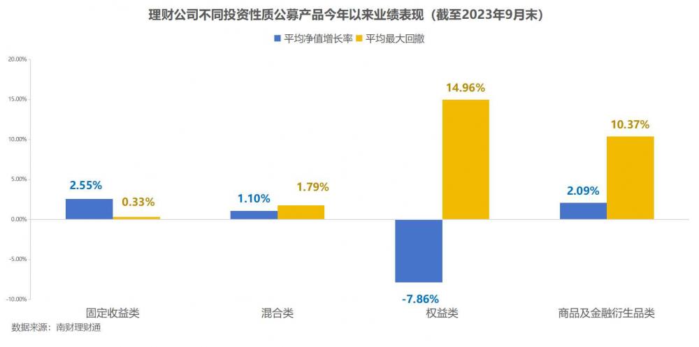 南财理财通数据显示,截至9月30日,固定收益类、混合类和商品及金融衍生品类公募产品今年以来平均净值增长率录得正收益,分别为2.55%、1.1%和2.09%;权益类公募产品今年以来平均净值增长率为负,为-7.86%。南财理财通需要提醒的是,除商品及金融衍生品类理财外,其他类别理财今年以来至9月末净值增长幅度较今年以来至8月收窄,以固定收益类产品为例,今年以来平均净值增长率由2.57%降至2.55%,即固定收益类产品9月单月平均净值增长为负。最大回撤方面,固收类产品回撤幅度最小,为0.33%,权益类产品平均回撤幅度最大,平均最大回撤达到14.96%。