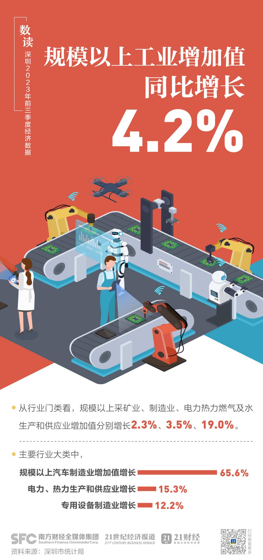 工业表现方面,前三季度,深圳工业生产平稳增长。全市规模以上工业增加值同比增长4.2%。从行业门类看,规模以上采矿业、制造业、电力热力燃气及水生产和供应业增加值分别增长2.3%、3.5%、19.0%。