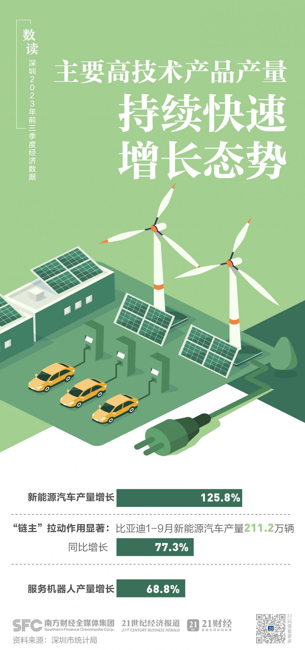 前三季度,深圳主要高技术产品产量持续快速增长态势。其中,新能源汽车、服务机器人产量分别增长125.8%、68.8%。