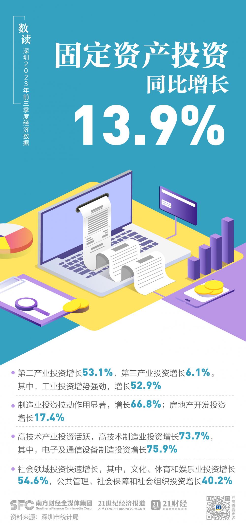 从投资、消费、出口“三驾马车”的情况看,前三季度,深圳固定资产投资同比增长13.9%,持续较快增长态势。分产业看,第二产业投资增长53.1%,第三产业投资增长6.1%。其中,工业投资增势强劲,增长52.9%。
