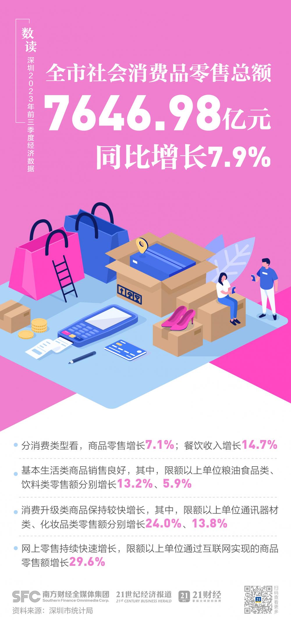 前三季度,深圳市场销售继续恢复。全市社会消费品零售总额7646.98亿元,同比增长7.9%。分消费类型看,商品零售增长7.1%;餐饮收入增长14.7%。