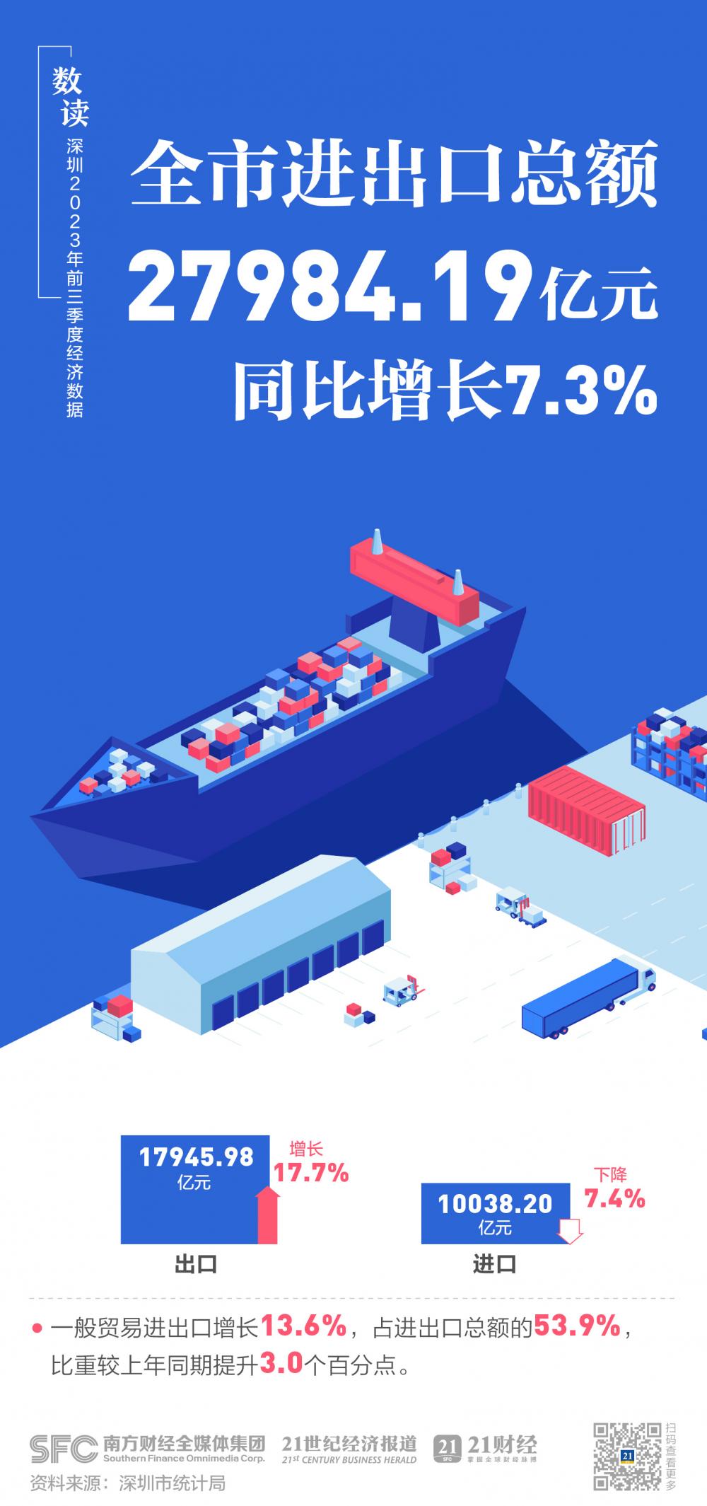 进出口同样保持增长。前三季度,深圳全市进出口总额27984.19亿元,同比增长7.3%。其中,出口17945.98亿元,增长17.7%;进口10038.20亿元,下降7.4%。其中,一般贸易进出口增长13.6 %,占进出口总额的53.9%,比重较上年同期提升3.0个百分点。