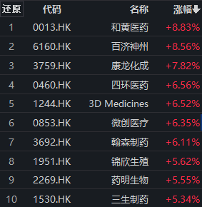 港股医疗保健板块早盘快速拉升。截至发稿,相关指数中,中证港股通医药卫生综合指数 (930965)一度涨超4%,成分股多数走高。上涨个股中,和黄医药涨近9%,百济神州涨超8%,康龙化成涨近8%,四环医药、3D Medicines、微创医疗、翰森制药涨逾6%,锦欣生殖、药明生物、三生制药等跟涨。