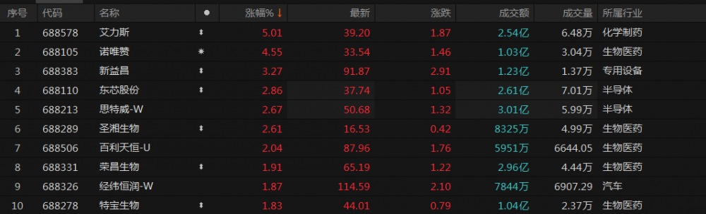 涨幅方面,艾力斯涨超5%,诺唯赞涨超4%,新益昌涨超3%,东芯股份、思特威-W、圣湘生物、百利天恒-U涨超2%。