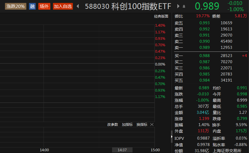跟踪科创100的ETF中规模最大的科创100指数ETF(588030)盘中低位震荡,截至发稿,该ETF跌1%,成交额突破3亿元,换手率9.59%,交投活跃,盘中频现溢价交易,溢折率0.03%。