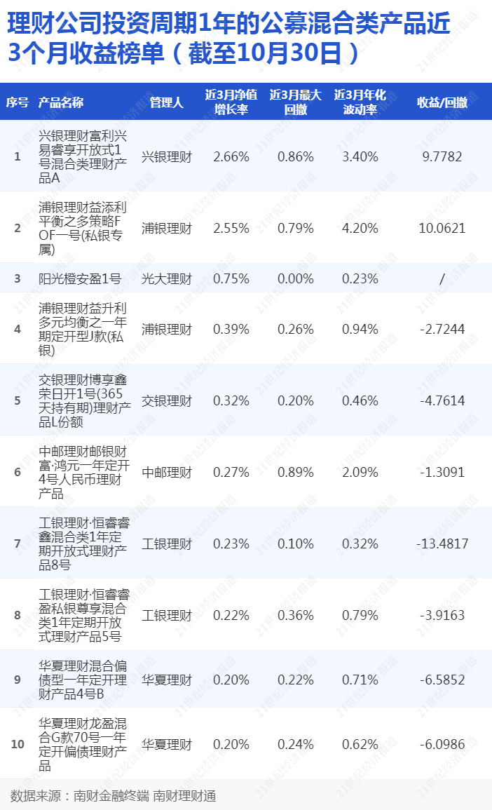 据南财理财通数据,截至2023年10月30日,在理财公司投资周期为1年的混合类公募产品近3月业绩排行榜中(同系列产品只保留一只),共有7家理财公司上榜,分别为兴银理财、浦银理财、光大理财、交银理财、中邮理财、工银理财和华夏理财。