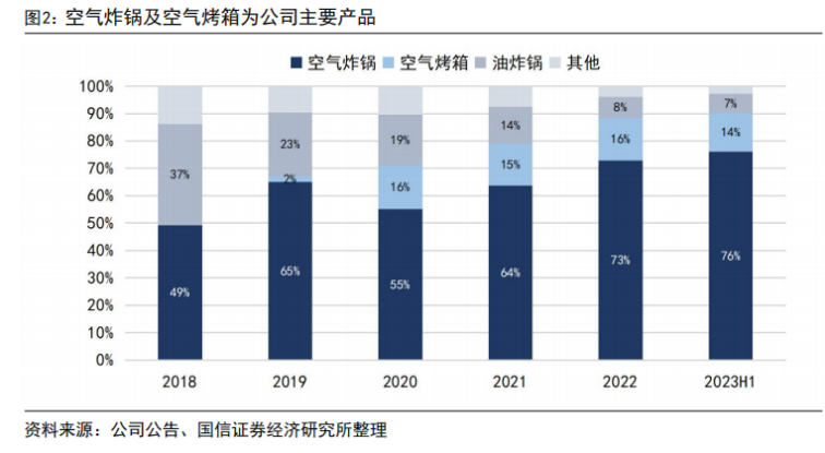财报显示,空气炸锅销售占公司营收比例已经从2018年的49%提升至2023年H1的76%,传统油炸锅收入占比则从37%缩减至7%。