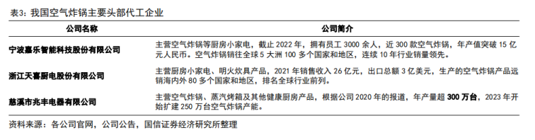 从行业数据来看,空气炸锅代工格局较为集中,行业CR3接近30%。国内空气炸锅代工龙头主要集中在浙江省,包括宁波嘉乐智能、浙江天喜厨电和慈溪市兆丰电器均为行业龙头,其中嘉乐智能和天喜厨电规模相对较高。