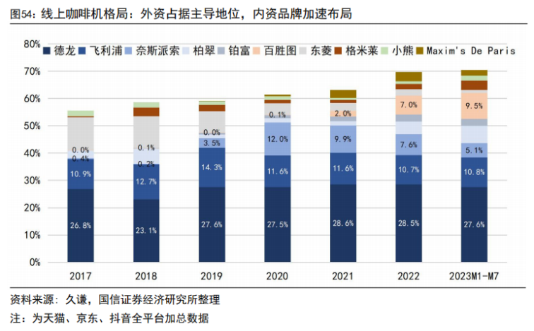 奈斯派索为雀巢旗下品牌,主打胶囊咖啡机,市占率从2020年的12%缩小至2023年M1-M7的5%;
