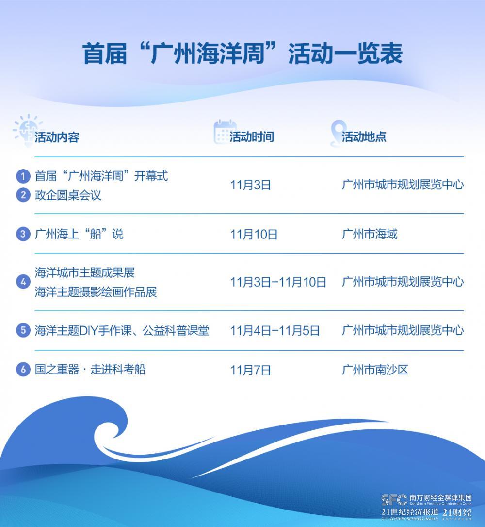 “广州海洋周”开幕式将于11月3日在广州市城市规划展览中心举行,邀请国内国际海洋领域专家学者代表作主旨演讲分享,社会各界关心广州海洋发展的人士将齐聚一堂为“广州海洋周”盛大启幕。开幕式当天下午还将举行一场政企圆桌会议,广州市政府部门代表和涉海企业代表将围绕海洋创新发展话题深入交流。