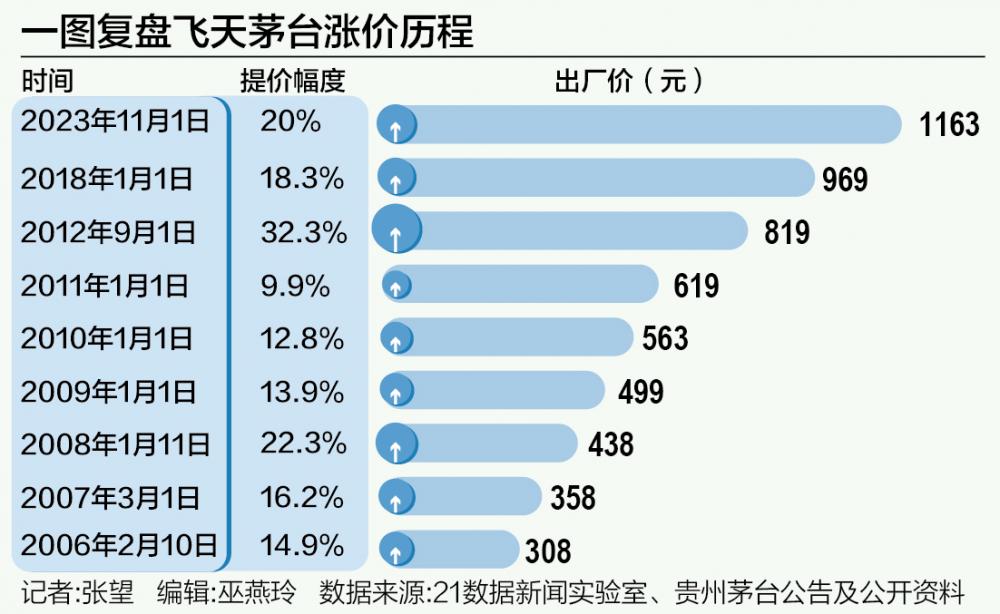 而2001年至今,飞天进行了9次提价,出厂价年复合涨幅为7.93%,本次系贵州茅台时隔5年10个月后提价。