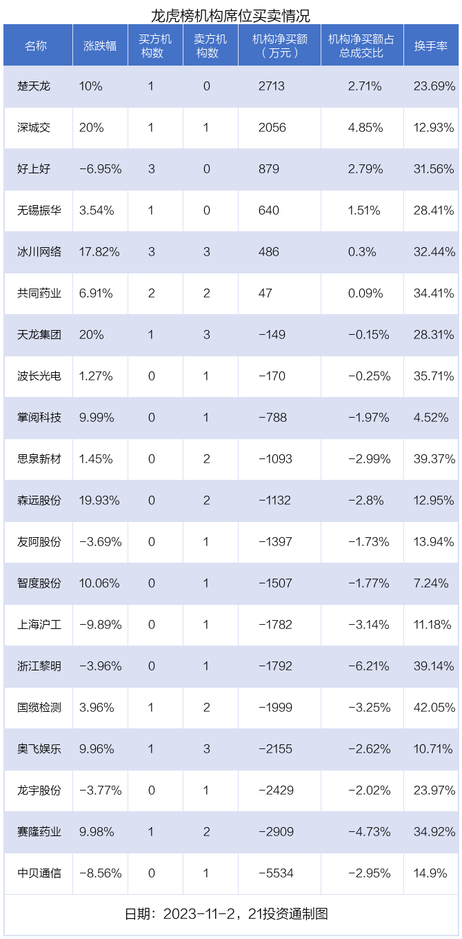 11月2日,20只个股龙虎榜出现了机构的身影,机构合计净卖出1.8亿元。具体来看,机构净买入6股,净卖出14股。