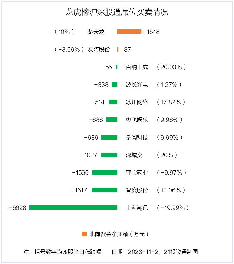 11月2日,北向资金参与龙虎榜中的个股共有11只,合计净卖出1.08亿元。其中沪股通净卖出2 股,合计净卖出2554.42万元;深股通净买入2 股,净卖出7股,合计净卖出8227.06万元。