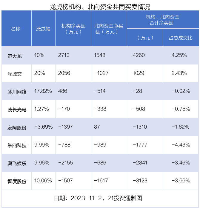 值得注意的是,机构和北向资金共同净买入了楚天龙等1股;共同净卖出了波长光电、奥飞娱乐、掌阅科技、智度股份等4股;在友阿股份,冰川网络,深城交上出现分歧,机构净卖出友阿股份1397.11万元,北向资金净买入87.39万元;机构净买入冰川网络485.97万元,北向资金净卖出513.7万元;机构净买入深城交2055.64万元,北向资金净卖出1026.82万元。