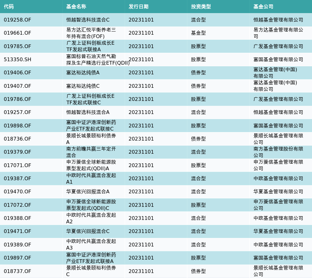 11月1日有20只新基金发行,分别为:恒越智选科技混合C、易方达汇悦平衡养老三年持有混合(FOF)、广发上证科创板成长ETF发起式联接A、富国标普石油天然气勘探及生产精选行业ETF(QDII)、富达裕达纯债A、富达裕达纯债C、广发上证科创板成长ETF发起式联接C、恒越智选科技混合A、富国中证沪港深创新药产业ETF发起式联接C、景顺长城景颐裕利债券A、南方前瞻共赢三年定开混合、申万菱信全球新能源股票型发起式(QDII)A、中欧时代共赢混合发起A1、华夏信兴回报混合A、申万菱信全球新能源股票型发起式(QDII)C、中欧时代共赢混合发起A2、华夏信兴回报混合C、中欧时代共赢混合发起A3、富国中证沪港深创新药产业ETF发起式联接A、景顺长城景颐裕利债券C,详情见下表: