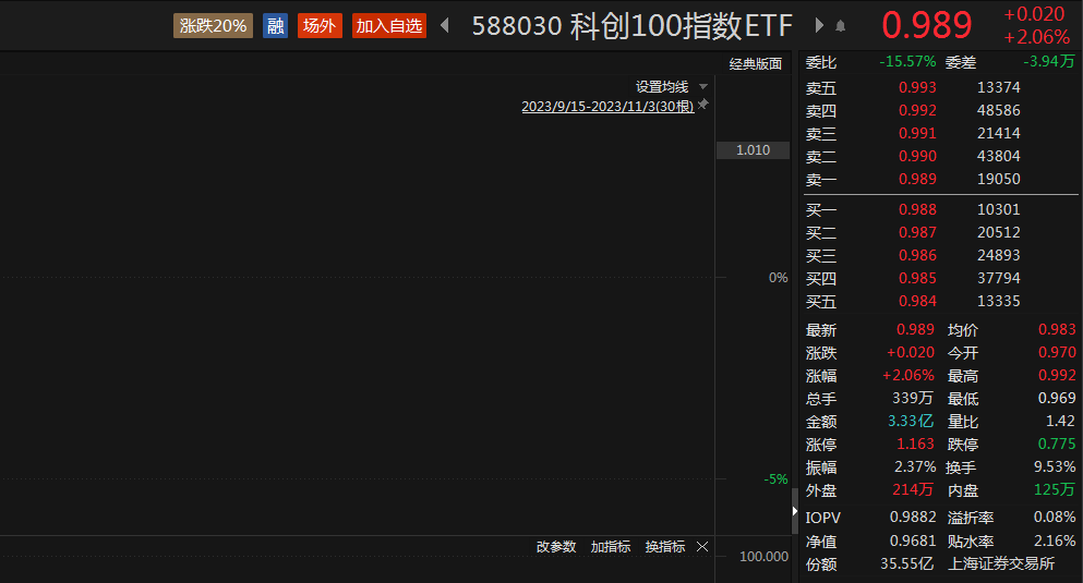 科创100指数ETF(588030)大涨超2%,溢折率0.08%,盘中交投活跃。近20日获大量资金流入,合计金额超11.45亿元,最新份额增长至35.55亿份,最新规模超34.41亿元,均位居同标的产品第一。