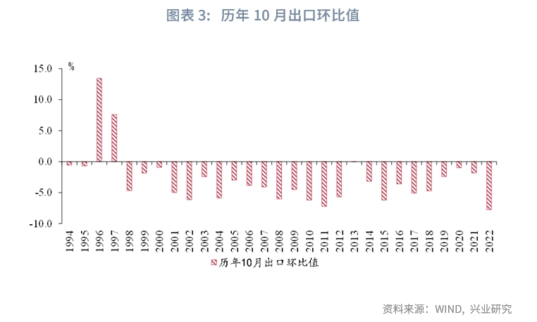 在出口方面,需求边际改善叠加出口基数走低,10月出口同比降幅有望进一步收窄。从需求看,10月美国Markit制造业PMI初值录得50.0%,为2023年4月以来首次站至荣枯线上。以美国为代表的发达经济体需求逐步修复,有望带动我国对美国出口订单逐步回升。从基数效应看,2022年10月出口环比下降7.8%,为1994年以来历年同期最低值。