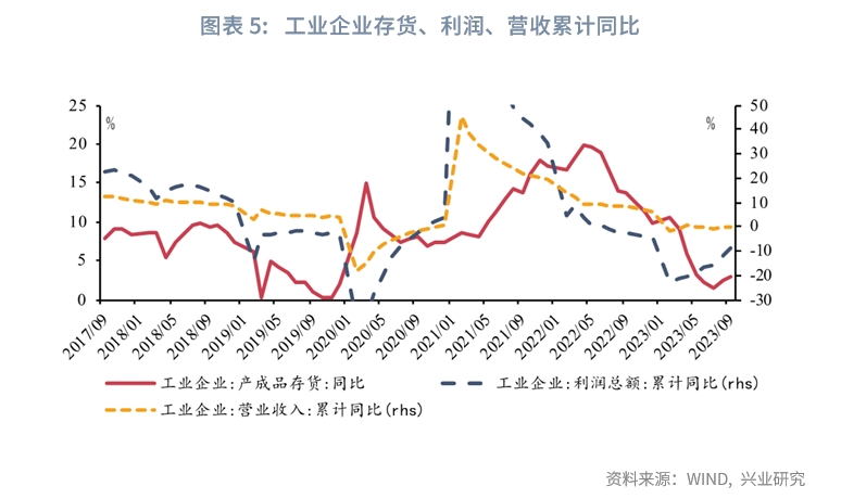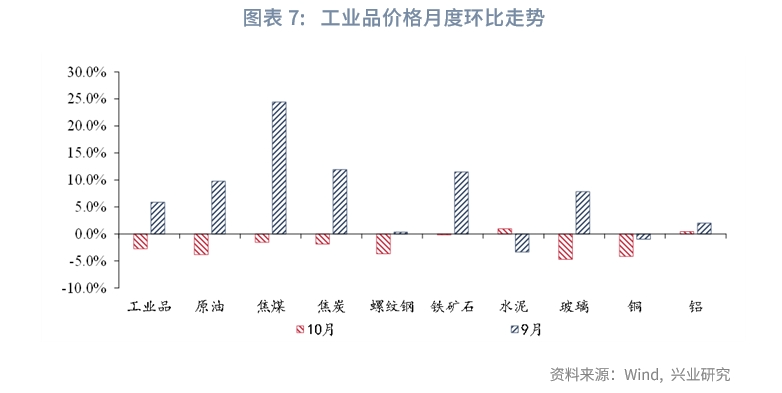 10月工业品价格在前期连续上升后出现回落。原油价格10月份环比-3.8%,受到巴以冲突对市场的影响减弱以及美国同意放松对委内瑞拉制裁的影响。黑色系中螺纹、铁矿、焦炭环比-3.7%、-0.2%、-1.8%,随着稳增长政策的陆续出台,黑色系商品价格在上半月较弱的表现之后出现反弹。水泥价格在库容比回落的情况下出现企稳,环比1.0%。有色金属价格小幅分化,铜、铝环比-4.2%、0.5%。综合来看,10月PPI同比预计录得-2.6%。