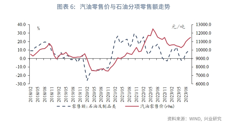 商品零售方面,第三季度居民消费倾向显著改善,将对商品消费形成重要支撑。伴随着商品住宅销售降幅收窄,后地产周期商品对于商品零售的拖累或减轻;10月汽油价格环比继续上涨1.8%,支撑作用持续;新能源汽车下乡政策效用显现,乘联会数据显示,10月乘用车零售同比或增长9.5%。上述高权重分项有望拉动商品零售录得较高增长。