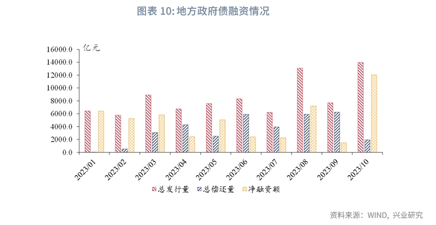 社融方面,一方面,10月信贷增速整体稳定;另一方面,10月地方政府债净融资明显提速,预计10月单月政府债融资规模再次超过万亿,这两项均对社融规模形成支撑。综合来看,10月新增社融预计为2.03万亿,对应的社融同比增速为9.1%。此外,10月24日,十四届全国人大常委会第六次会议表决通过国务院增发国债和2023年中央预算调整方案的决议,中央财政将在今年四季度增发2023年国债10000亿元,作为特别国债管理。值得注意的是,本次万亿特别国债发行将在2023年内全部完成,预计11月与12月政府债净融资规模均将超过万亿水平。