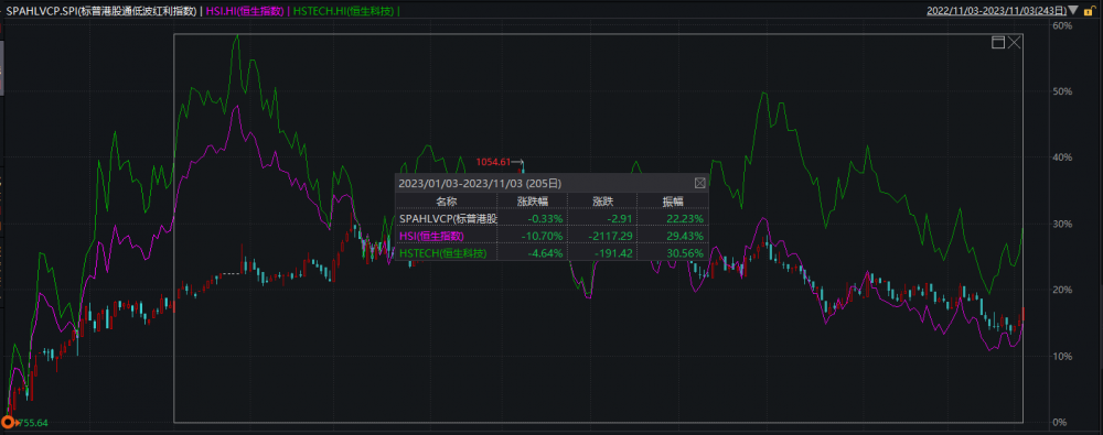 今年以来,港股市场震荡调整。截至11月3日,恒生指数跌超10.70%,恒生科技指数跌近5%。标普港股通低波红利指数小幅下跌0.33%,跑赢恒生指数超10个百分点,跑赢恒生科技指数超4个百分点,明显优于同期主要大盘指数表现。