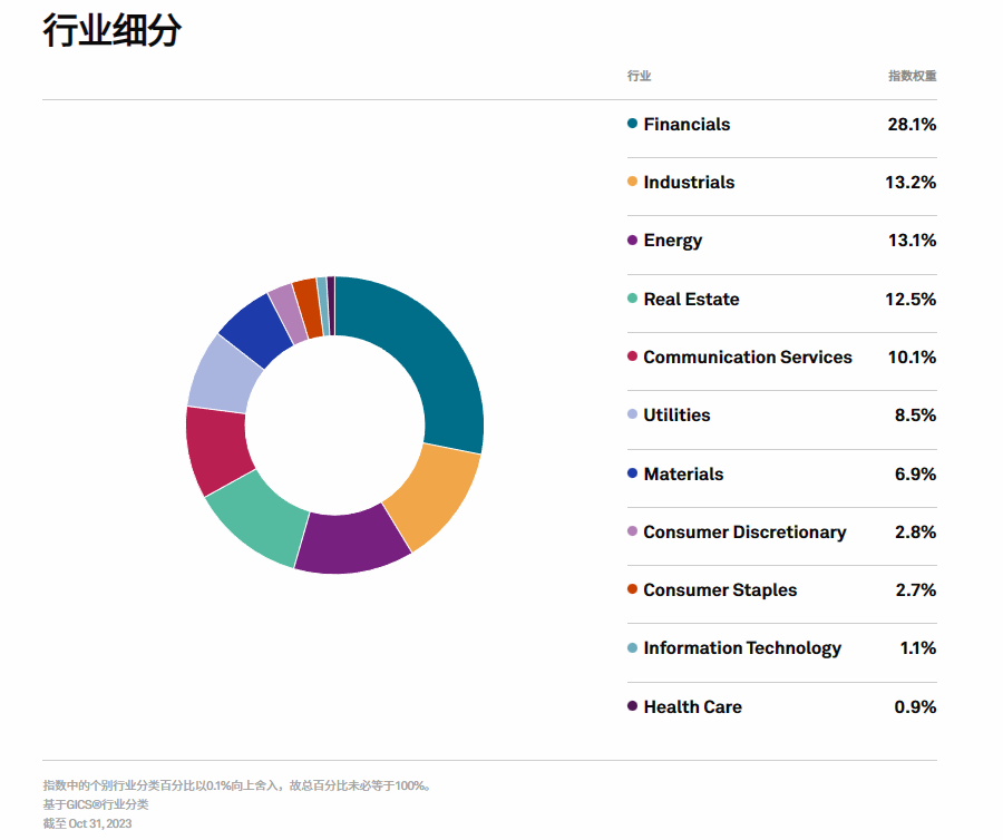 标普道琼斯指数公司最新数据显示,截至10月31日,从行业来看,标普港股通低波红利指数重点配置金融、工业、能源等估值较低、分红较高的板块。其中,金融占比28.1%居首位,工业、能源、房地产、通信服务分列第2—5位,权重占比均超过10%。