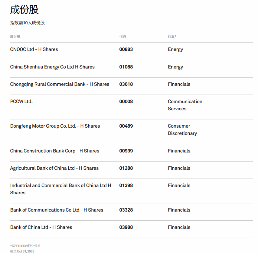 从个股来看,截至10月31日,指数前十大成份股分别为中国海洋石油、中国神华、重庆农村商业银行、电讯盈科、东风集团股份、建设银行、农业银行、工商银行、交通银行以及中国银行。