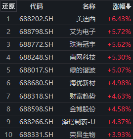 科创板个股早盘迎来普涨行情。截至发稿,相关指数中,科创100指数(000698)涨近2%,大多数成分股出现上涨。其中,美迪西涨超6%,艾为电子、珠海冠宇、南网科技、绿的谐波涨逾5%,海优新材、财富趋势、金博股份、泽璟制药-U、荣昌生物等跟涨。